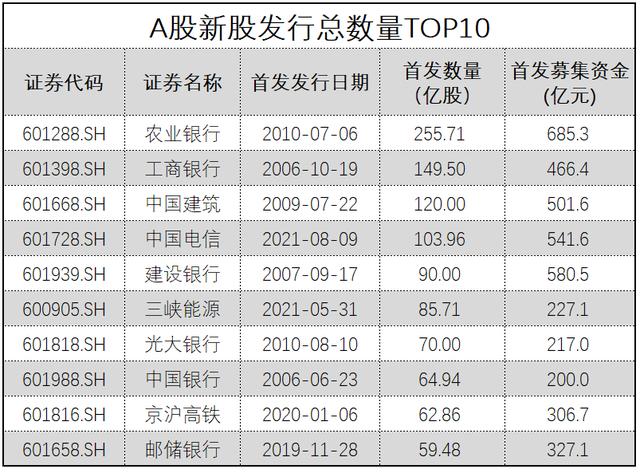 值得一提的是,此次中国电信发行总数高达103.96亿股(超额配售选择权全额行使前),直接跻身A股发行数量榜的第4位,更是近11年以来新股发行数量最多的上市公司。据数据显示,高居A股新股发行数量榜首位的是农业银行,发行总数高达255.71亿股,工商银行紧随其后,发行总数达149.5亿股。
