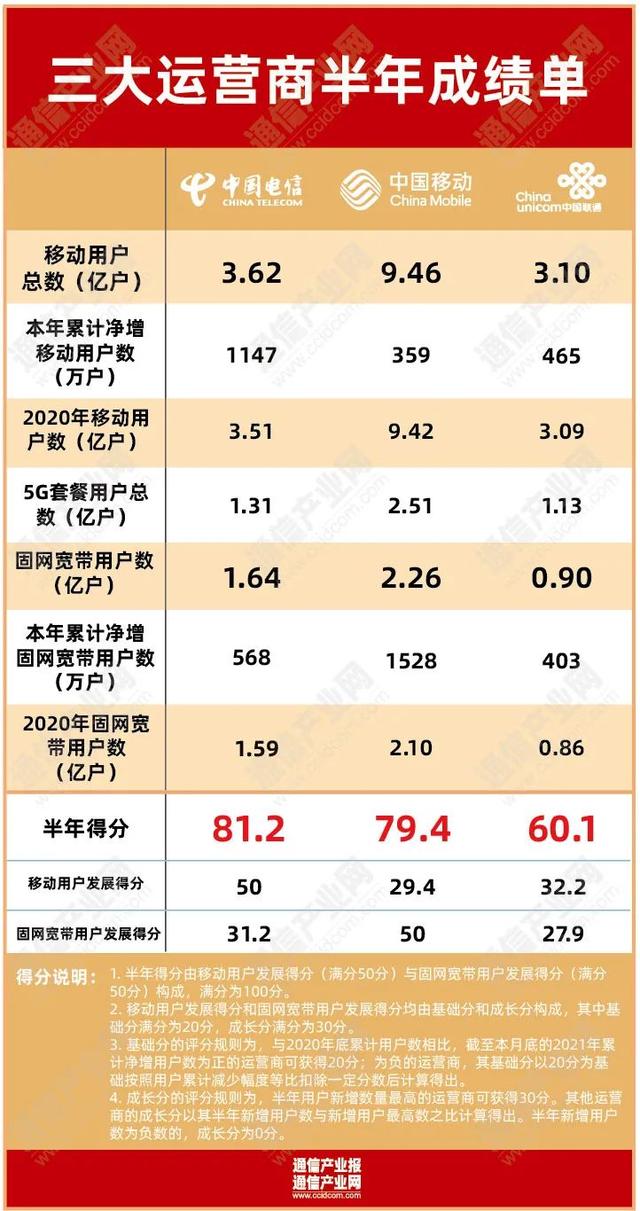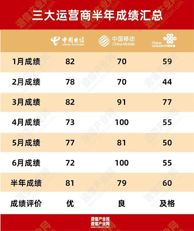 根据《通信产业报》全媒体监测的月度运营商用户发展情况,根据评分规则,综合来看,中国电信因在移动通信市场突飞猛进,且巩固着固网市场大盘,半年判定为优。