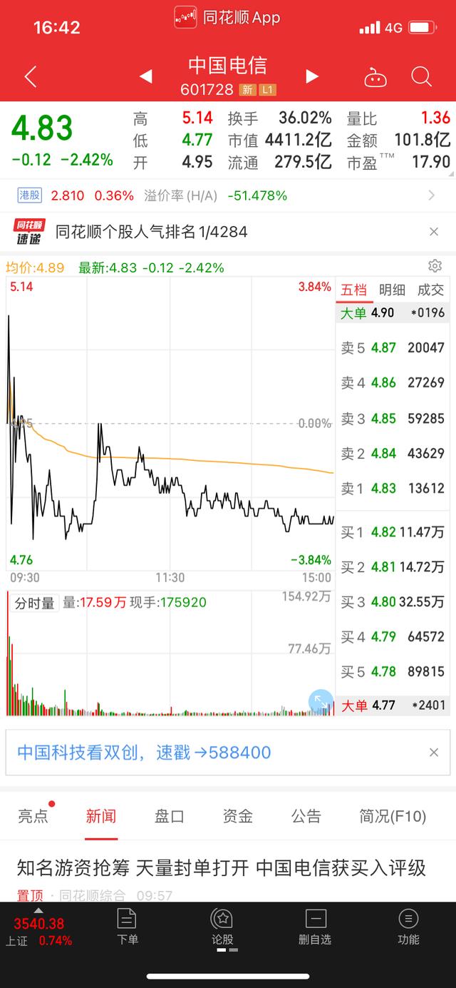 针对股价下跌,24日,中国电信股份有限公司发布股票交易异常波动公告,公告称,中国电信A股股票连续两个交易日内收盘价格跌幅偏离值累计超过20%,属于股票交易异常波动。经公司自查并书面询证公司控股股东中国电信集团有限公司,截至公告披露日,不存在应披露而未披露的重大信息。不存在筹划涉及上市公司的重大资产重组、股份发行、收购、 债务重组、业务重组、资产剥离、资产注入、股份回购、股权激励、 破产重整、重大业务合作、引进战略投资者等重大事项。