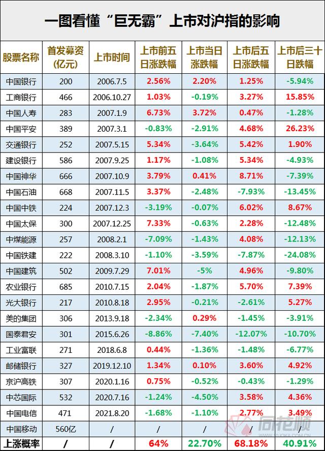 数据统计显示,在“巨无霸”上市的前五个交易日大盘上涨的概率为64%;上市当日大盘上涨的概率仅为22.7%;上市后五个交易日大盘上涨的概率为68.18%;上市后三十个交易日大盘上涨的概率为40.9%。综合来看巨无霸上市当日以及三十个交易日大盘下跌的概率较大。