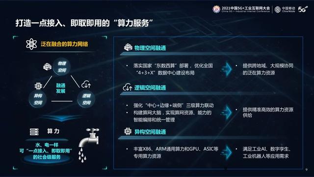 我们将构建泛在融合的算力网络,推动算力在物理空间、逻辑空间、异构空间的融通发展,使算力成为像水、电一样,可“一点接入、即取即用”的社会级服务。在物理空间融通方面,面向国家“东数西算”部署,进一步优化全国“4+3+X”数据中心建设布局,为企业研发、制造、销售、服务等环节的跨地域、大规模协同提供泛在算力支撑。在逻辑空间融通方面,面向“中心+边缘+端侧”三级算力联动,加快工业边缘云节点建设,打造支持多种工业协议的行业“云终端”,构建“算网大脑”,推动算网资源、能力的智能编排、统一管理,实现算力精准高效供给。在异构空间融通方面,进一步丰富X86、ARM通用算力和GPU、ASIC等专用算力资源,高效满足工业AI、数字孪生、工业机器人等多样化应用对于不同类型算力的需求。