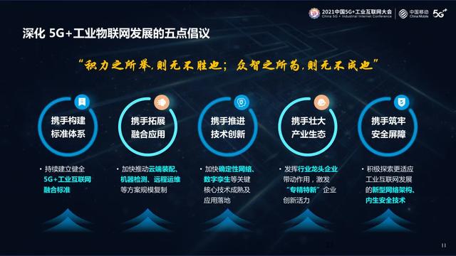 杨杰提出,中国移动愿与各界伙伴携手,共同推动5G和工业互联网深度融合,更好赋能实体、服务社会、造福人民,为此提出五点倡议。一是携手构建标准体系,持续建立健全5G+工业互联网融合标准;二是携手拓展融合应用,加快推动云端装配、机器检测、远程运维等标准化方案的规模复制推广;三是携手推进技术创新,强化政产学研用深度融合,加快推动确定性网络、数字孪生等关键核心技术的成熟落地;四是携手壮大产业生态,发挥行业龙头企业带动作用,激发“专精特新”企业创新活力,促进新业态新模式不断涌现;五是携手筑牢安全屏障,积极探索研究更适应工业互联网发展的新型网络架构及内生安全技术,持续建强安全保障能力。