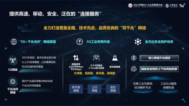 我们将全力打造覆盖全国、技术先进、品质优良的“双千兆”网络。一是深化网络共建共享、多频协同,推动5G网络向深度覆盖发展,确保2022年底前基本实现全国乡镇以上5G连续覆盖,以及重要园区、热点区域的有效覆盖;面向产业园区等重点场所实现千兆光纤网络覆盖。二是推动5G工业专网升级,加快引入多天线增强、上行增强、定位增强等关键功能,满足大带宽、低时延、高可靠、高精度等工业企业重点需求。三是构建全方位安全防护体系,加快标识解析节点建设,完善工业SLA服务保障标准,确保工业生产核心数据不出园区,实现网络安全威胁自发现和上下协同自防御,筑牢工业领域安全屏障。