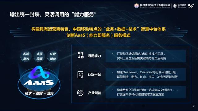 我们将加快建设具有运营商特色、中国移动特点的“业务+数据+技术”智慧中台体系,创新AaaS服务模式。在通用能力方面,依托集中统一的智慧中台,汇聚和积淀内外部优质能力和共性技术工具,实现机器视觉、远程操控、安全防护等工业企业所需关键能力的灵活调用。在行业平台方面,通过智慧中台的敏捷支撑和高效共享,加速OnePower、OnePoint等行业平台的升级,更好赋能制造、电力、矿山、港口、冶金等领域创新。在产业赋能方面,构建数智化咨询和一站式集成交付能力,打造面向多样化场景的DICT解决方案,加速千行百业的数智化转型。