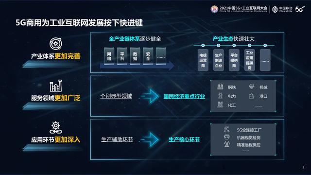 杨杰认为,5G+工业互联网的融合创新,正是信息技术深度赋能实体经济的具体体现。自5G商用后,工业互联网发展按下快进键,呈现三方面发展趋势。一是产业体系更加完善,网络、平台、数据、安全等全产业链体系逐步健全,由电信运营商、生产制造企业、平台服务提供商、工业应用提供商等组成的产业生态快速壮大。二是服务领域更加广泛,从个别典型领域向钢铁、机械、电力等数十个国民经济重点行业加速扩散,高端领域竞争力逐步提升。三是应用环节更加深入,从生产辅助环节向生产核心环节逐步渗透,5G全连接工厂、机器视觉检测、精准远程操控等应用场景已具备规模复制条件。中国移动一直将“工业互联网”作为5G发展的主战场,全面建立5G+工业互联网“1+1+1+N”产品体系,携手产学研各领域多家单位成立5G+工业互联网创新联合体,在工业领域打造了近30个典型应用场景,拓展实践1200余个5G+工业互联网项目,特别是面向湖北等工业大省,加快推动5G+智慧工厂、5G+智慧矿山等项目落地。