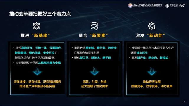 杨杰认为,推动这一转变,要把握好三个着力点:一是推进新基建,加快建设高速泛在、天地一体、云网融合、智能敏捷、绿色低碳、安全可控的智能化综合性数字信息基础设施,提供泛在连接、泛在计算、泛在智能服务,加速资源整合范围从局部拓展为全局,不断突破生产效率瓶颈。二是融合新要素,加快数据在多场景的流通复用,打破地域、行业、专业分工壁垒,持续孵化新工艺、新技术、新手段,不断满足、引领、创造超大规模个性化需求。三是激发新动能,加快新一代信息技术在生产核心环节的纵深推进,持续激发工业领域的新产业、新业态、新模式,推动经济发展质量变革、效率变革、动力变革。
