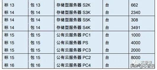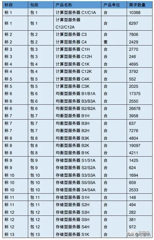 根据之前公布的总的16个标包的服务器采购量来看,标包1的计算型服务器采购量为16665台、标包2的计算型服务器采购量为10235台/套、标包6的均衡性服务器采购量为46603台、标包9的存储型服务器采购量为2049台、标包10的存储型服务器采购量为4886台、标包15的公有云服务器采购量为15000台。