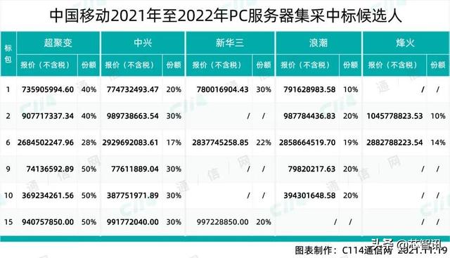 11月19日,中国移动采购与招标网发布了“2021年至2022年PC服务器集中采购(第1批次)中标候选人公示”。此次公布的是“标包1、标包2、标包6、标包9、标包10、标包15”共6个标包的中标情况。