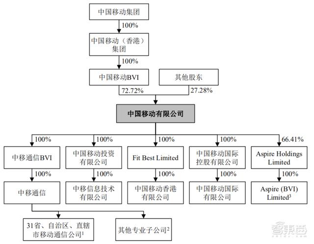 中国移动BVI直接持有中国移动14,890,116,842股的股份,为其控股股东。中国移动集团通过其全资子公司中国移动(香港)集团持有中国移动BVI 100%的股份,为中国移动的实际控制人。此外,中国移动还有CMPak Limited、中移资本等公司控股。