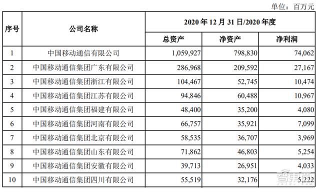 此外,中国移动旗下共有22家子公司,其中,中国移动通信有限公司、中国移动通信集团广东有限公司、中国移动通信集团浙江有限公司在总资产中位列前三。