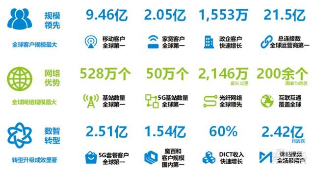 在国内市场上,中国移动已成为国内市场客户规模最大的家庭宽带运营商和大屏内容服务提供商。不仅如此,中国移动还落地全国首个5G+智慧电网、首个无人驾驶矿用卡车、首个5G远程手术和首个5G全场景智慧港口项目。