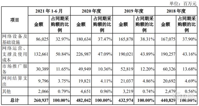 2021年上半年,网络运营、支撑及使用成本占同期采购额的比例的比例为50.84%。
