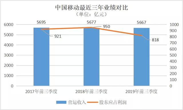 老冀认为,目前中国移动最头疼的恐怕还不是利润下降,而是收入不增长了:2017-2019年前三季度,中国移动的营运收入分别为5695亿元、5677亿元、5667亿元,连续两年都出现了微小的下滑。