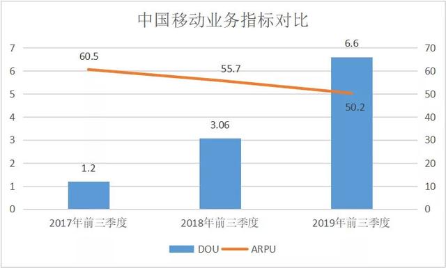 2017-2019年前三季度,中国移动的DOU(每个用户每个月使用的数据流量)分别为1.2GB、3.06GB、6.6GB,但是ARPU(每个用户每个月缴纳的移动资费)却是持续下降。实际上,我们很多中国移动的用户都能够感受到这种变化趋势:每过一年,我们使用的数据流量就有很大的增长,但是交的钱反而更少了。