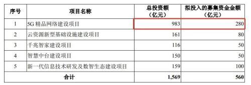 中国移动募投项目包括5G精品网络建设项目、云资源新型基础设施建设项目、千兆智家建设项目、智慧中台建设项目等,总投资1569亿元,募集资金规模560亿元。其中,5G精品网络建设项目总投资额983亿元,拟投入280亿元募集资金,占总募集资金的50%。该项目计划新建5G基站不少于50万个,同时建设5G SA核心网及网络云资源池,支撑大众市场和垂直行业规模发展。