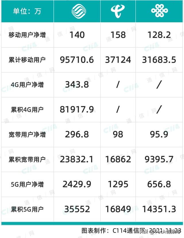 具体来看,中国移动继续保持一家独大的优势。截止2021年10月底,中国移动的移动用户数为9.57亿户,较上个月净增140万户,今年累计净增1518.8万户。5G套餐用户数方面,目前移动的5G套餐用户数已达3.56亿户,较上月净增2429.9万户,这而这已是连续5个月实现超2000万的增长,5G套餐用户渗透率则为37%。4G用户数和固网宽带数方面,当月分别净增了343.8万户、296.8万户,同样保持着良好的发展势头。