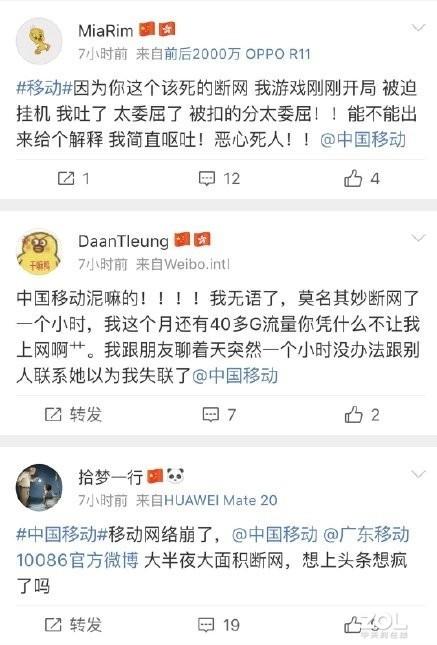引网友纷纷吐槽,“刚刚有将近半个小时没有网,我还特意给移动打电话,原来是好多人都这样了”、“我以为只有我手机这样,昨晚发得出微信信息,看得了电视竟然就是刷不出微博还有其他”、“耽误我看片!!!”、“我憋了好久,还以为只有我一个人总是断网”