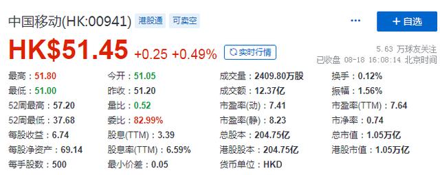 8月18日,中国移动(00941.HK)涨0.49%,另外两家在港上市的运营商中国电信(00728.HK)下跌1.96%,中国联通(00762.HK)上涨1.6%。