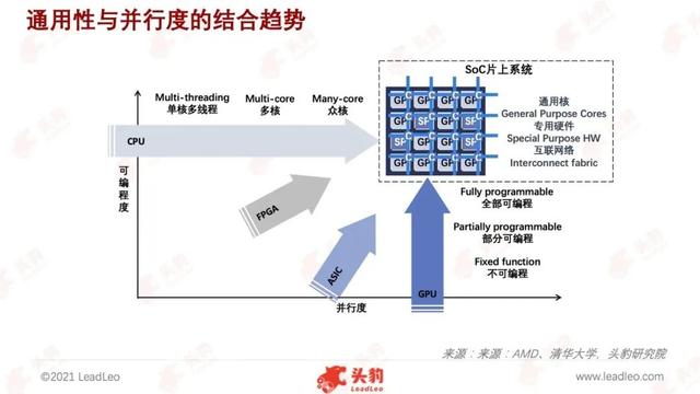 在移动互联网时代,单一芯片应对不同形式计算力不从心,异构计算成为主流。移动设备或者云平台需要处理各种各样的信息,包括通讯、执行程序、处理图片、娱乐游戏、处理各种传感器的信息等等。传统依靠类似 CPU 这样通用处理器来处理这些信息的效率非常低。CPU 这种为顺序计算而设计的处理器,一旦被占用,其他处理请求就只能等待,导致时间效率低。