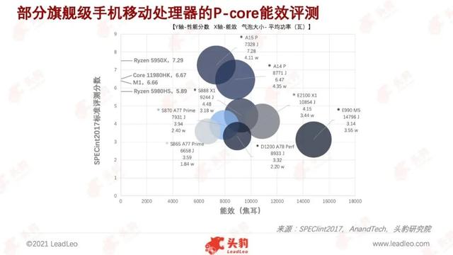 同样骁龙888,三星E2100,天玑1200等各大手机端移动处理器厂商的旗舰与次旗舰产品在性能、功耗和能效上的表现也不相上下。需要提及的是,六大手机处理器厂商都采用了ARM指令集+SoC架构的方案。