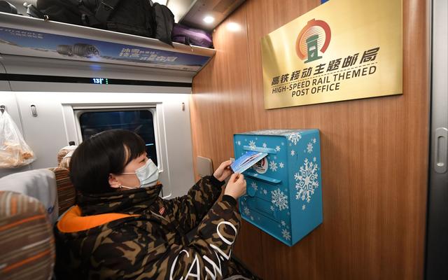 新京报快讯(记者 吴婷婷)12月21日,中国邮政在高铁上开设的首家主题邮局在京张高铁列车上亮相。这是目前移动速度最快的特色主题邮局。