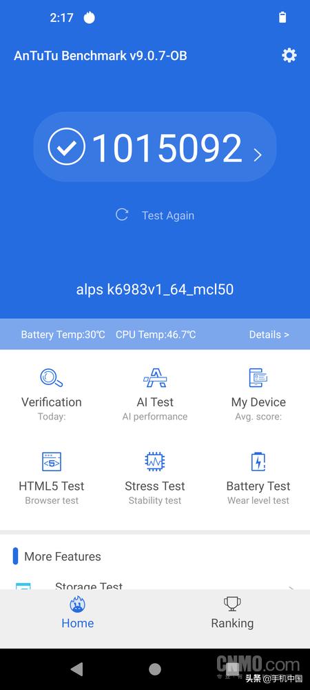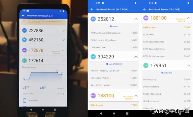 首先是安兔兔(V9.0.7),天玑9000最后跑出了1015092分的总成绩,CPU部分跑出了252812分的项目总分,单“多核性能”这一项上就跑出了119215分的成绩。GPU部分总项目分为394229分,三条测试单项的成绩毫无疑问纷纷破了“10W+”。内存读写速度方面,天玑9000的测试机跑出了77009的单项分。在CPU温度方面,天玑9000在跑分过程中几乎全程保持了60°的温度,在跑分结束后则降低到46.7°,不过在测试机这种没有额外辅助散热的情况下,跑分过程中我手摸到的机身体感温度却非常低,大概只有39°左右的样子。