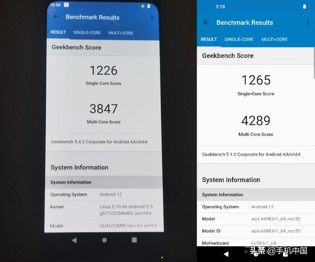 GeekBench成绩 左:骁龙8 Gen1 右:天玑9000