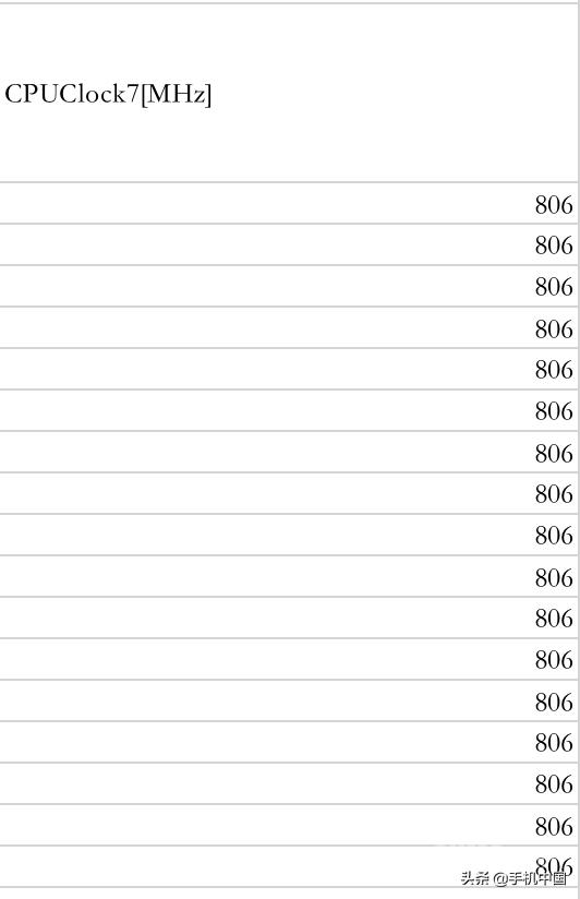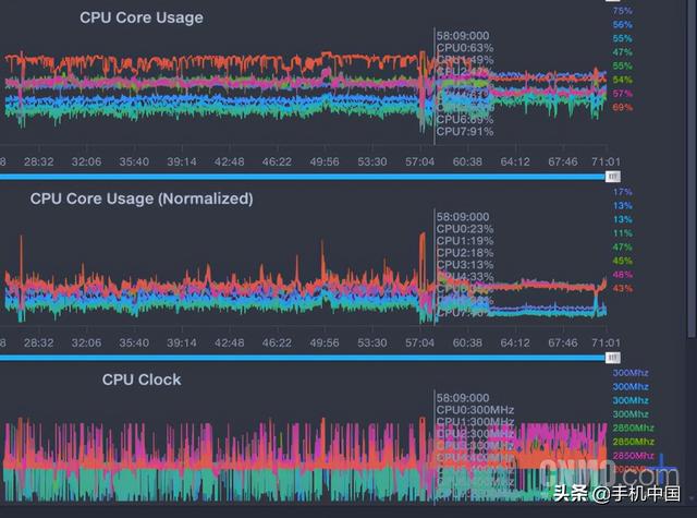 至于游戏全程的CPU频率、使用率、以及功耗等这些更加精细的数据,我将会在下面通过导出的excel表格的具体数据为大家展现,而我们也将通过这些数据去一步一步推断出天玑9000与众不同的CPU调度策略。“CPU调度策略”是更加深入和隐晦的一项数据,和“参数”相比,它和大众消费者接触的频率非常低,厂商鲜有提及,消费者鲜有问询。如果将整个CPU的硬件参数比作“总量”,那么“调度策略”则决定了CPU的“效率”,如果徒有华丽的参数但是没有高效的“调度策略”,那么就意味着这些“华丽的参数”实际的利用率非常低,亦如号称锋利的刀却从不它去割任何东西一样。这也是为什么很多芯片参数看上去很爆炸但是实际的表现却并不尽如人意的原因。和“参数”相比,有时候“调度策略”才是决胜的关键。不过从这些“缩略图”中我们依然可以发现一些有用的信息,例如在整个79分钟的《原神》游戏过程中,天玑9000 X2超大核的使用率几乎一直都维持在90%以上,说明游戏的主要数据处理大部分都是由它X2超大核完成的,其次X2超大核的日常频率也会一直维持在1.5GHz的半频待命状态,并不是完全的“两耳不闻窗外事”。