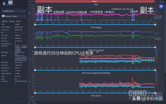 不过就在此时,我忽然灵光一闪,想到了PCMark测试时天玑9000的CPU频率分布图,一个大胆的想法忽然出现在我的脑海中:“会不会是因为天玑9000的CPU调度策略不同,会不会和那个活跃的X2超大核有关系。”但是想要印证我的猜想,就必须在天玑9000测试机运行《原神》时接入PerfDog以此来调取游戏运行过程中天玑9000更深层次的各项数据。所以我开始将我的设想偷偷告诉了一旁联发科的一位工作人员,并且用“言语蛊惑”她:“拜托,这是一个大胆的猜想,让我印证好不好,这对你们天玑9000也有利啊,我一定一定会保密,不会提前上传和泄露数据的,我保证这份数据走不出这撞办公楼,拜托拜托~~~让我接一次PerfDog吧~”