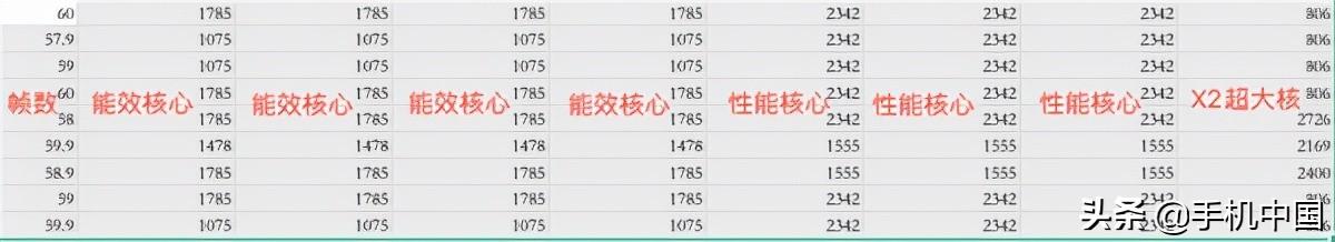 之后我们将目光锁定在不同的游戏场景下,天玑9000和骁龙8 Gen1它们各自所拥有的8个CPU是保持在怎样一个状态下运行的。首先在游戏平稳负载的状态下,天玑9000和骁龙8 Gen1在X2超大核的调度策略上,两者是完全相反的一个状态,将表格中CPU 7的所有频率按照“升序”排列后我们可以看到,天玑9000的X2超大核最低也是以1.3GHz的频率,保持在一个近乎半频的工作状态参与到游戏正常进程中的负载处理,而骁龙8 Gen1的X2超大核却将最低的负载频率下放至了0.8GHz,按照它X2最高3GHz主频来看,骁龙8 Gen1显然是非常“宝贝”这颗X2的超大核了。