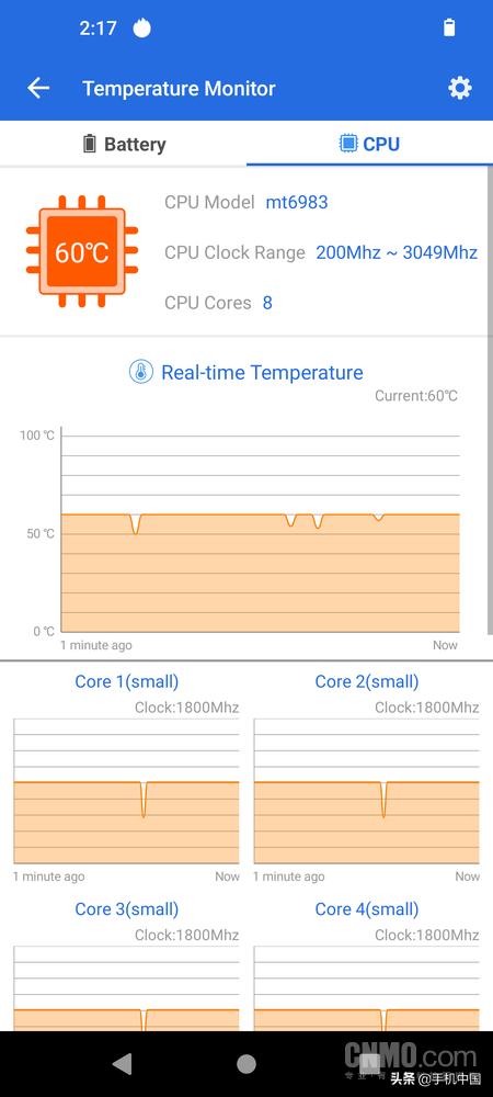 CPU频率方面没什么好说的,200Mhz-3049Mhz满血未锁帧,在跑分甚至是安兔兔软件平时待机的过程中,天玑9000的8个核心全部满帧运行,尤其是那个X2的超大核,别的7个核心可能会“偷偷的”休息一下下,但是X2核心完全是只要安兔兔在前台运行着它就保持着全程满频的状态运行没有停歇,这些从安兔兔展示的CPU频率图中可以很明显的看到,X2大核的部分没有一丝曲线下降的沟壑。不过这个现象完全正常,毕竟现在的CPU都会内置对跑分软件的环境监测机制,满状态跑分完全是可以理解的。