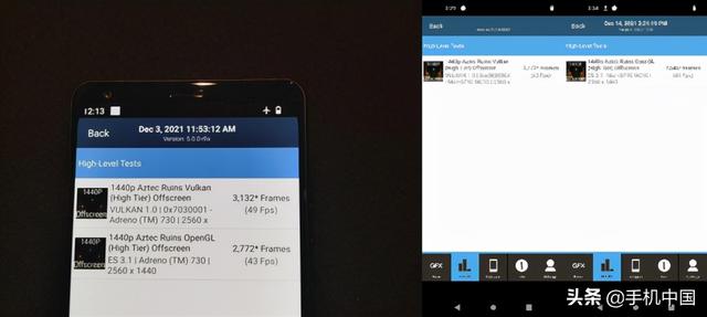 Vulkan &OpenGL(1440p)成绩 左:骁龙8 Gen1 右:天玑9000