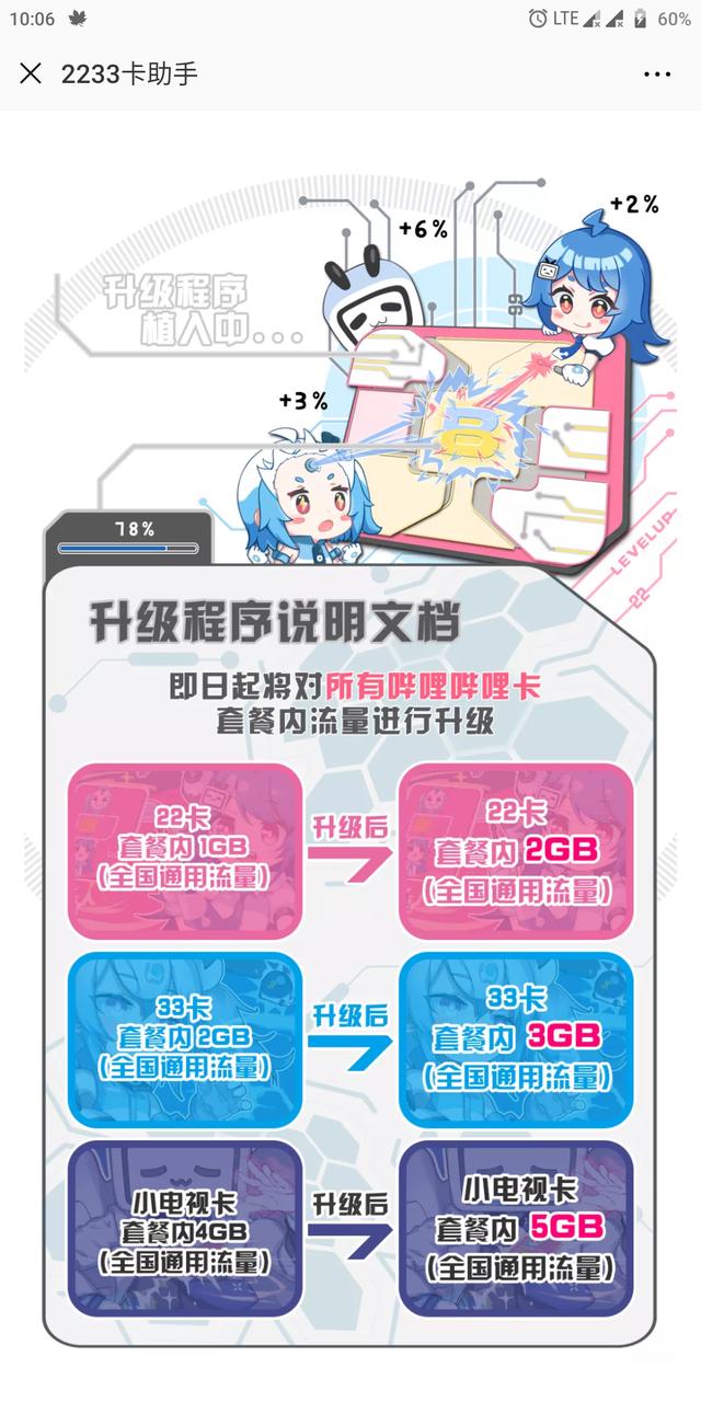 最近,哔哩哔哩卡公众号又推出了一项新的福利,那就是全部套餐流量大升级,原先的22卡1G全国流量升级成2G全国流量,33卡2G全国流量升级成3G全国流量,小电视卡的4G全国流量升级成5G全国流量。
