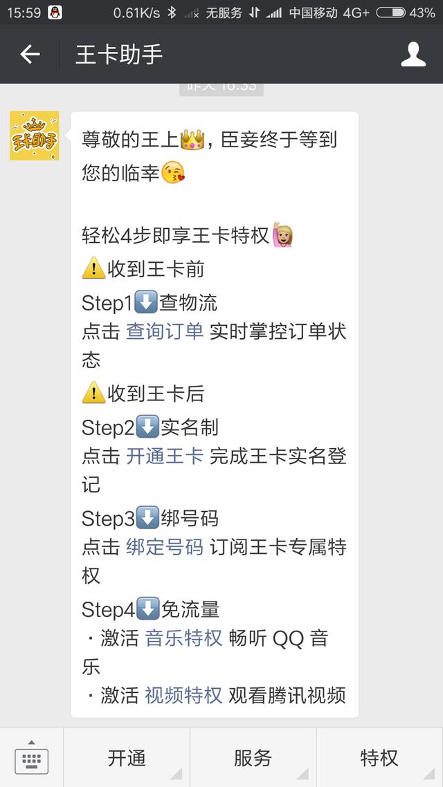 拿到卡后我们就要开通,绑定,激活,然后实名认证。具体方法可以微信关注官方公众号“王卡助手”,所有的步骤里面都会有指引。