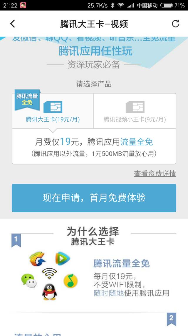 首先“大王卡”的月租只要19块钱,腾讯应用的流量全免,腾讯应用以外的应用流量按国内流量0.1元/MB,10~500MB只要1元,其实就是联通的日租卡。另外国内语音以及短/彩信都是0.1元/条。但是“大王卡”免流量也不是无限免的,它遵循国际通用流量原则,套餐内外上网流量累计使用到达40G时自动关闭上网功能,次月自动打开。换句话说就是19元包40G流量,只能在腾讯APP上使用。