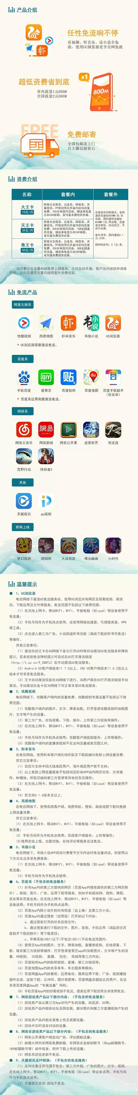 大王卡:月租19元,阿里大文娱系、百度系、网易系、天翼视讯、PP视频等应用省内定向流量免费、100分钟国内语音,赠送来电显示和189邮箱。首月基本费按天折算。