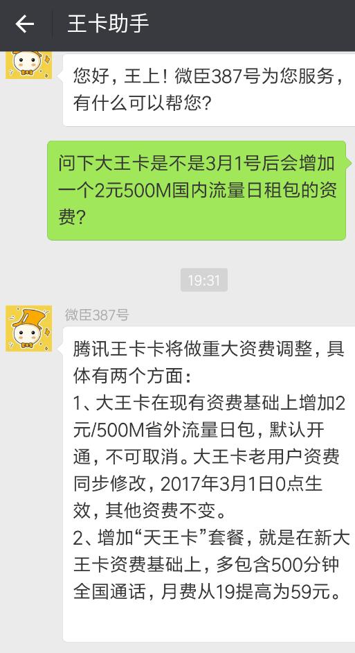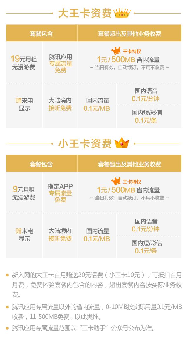 1、大王卡在现有资费基础上增加2元/500M省外流量日包,默认开通,不可取消。大王卡老用户资费同步修改,2017年3月1日0点生效,其他资费不变。
