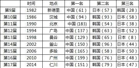 1982年至2014年,中国代表团自从登上亚运会奖牌榜第一的宝座之后,就没有从王座上离开。1990年,更是以领先第二名129枚金牌的惊人优势拔得金牌榜头筹。