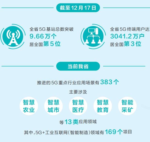 记者从省通信管理局获悉,截至12月17日,全省今年新开通5G基站5.12万个,5G基站总数突破9.66万个,居全国第5位,实现乡镇以上和农村热点区域5G网络全覆盖。全省5G终端用户达到3041.2万户,居全国第3位。