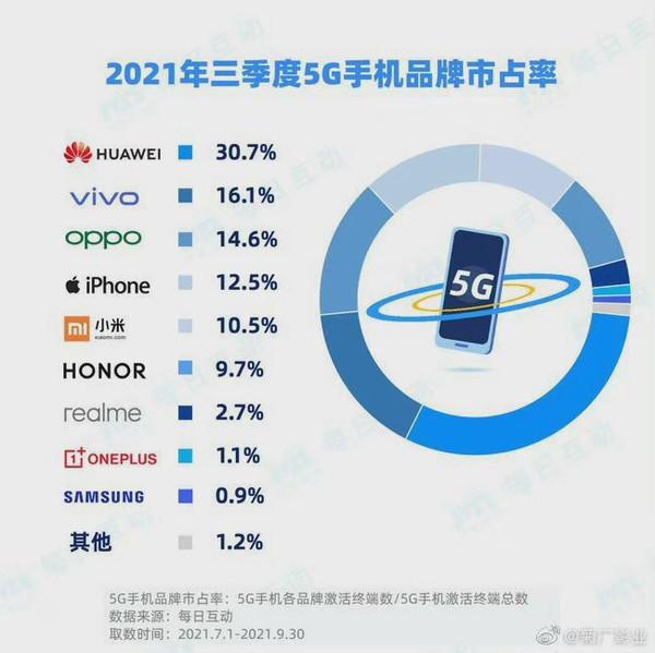 12月21日消息,根据相关机构公布的数据,今年三季度,5G手机市场占有率最高的还是华为(30.7%);排在第二的是vivo(16.1%),与华为相比还有一段距离;第三名是OPPO(14.6%),与vivo相差不大;接着是苹果(12.5%)、小米(10.5%)、荣耀(9.7%)、realme(2.7%)、一加(1.1%)和三星(0.9%)。