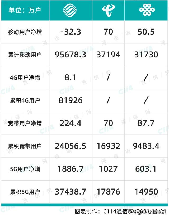 据中国移动发布的2021年11月的运营数据显示,该月中国移动净增客户数-32.3万户,4G客户当月净增8.1万户,5G套餐客户数净增1886.7万户。作为对比,2021年10月,中国移动净增客户数140万户,4G用户当月净增343.8万户,同时还净增了2429.9万5G套餐客户。