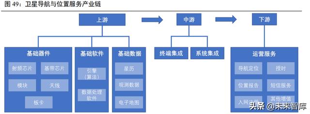我国卫星导航与位置服务产业链包括上游基础产品,中游各类终端和系统集成产品,以及下游应用及 运营服务环节。其中上游包括了基础器件,基础软件、基础数据等,是产业自主可控的关键,中游是目前 产业发展的重点环节,随着行业+北斗应用市场进一步扩大,以及位置服务向时空信息服务的转变,下游会 是未来产值的主要增长点。