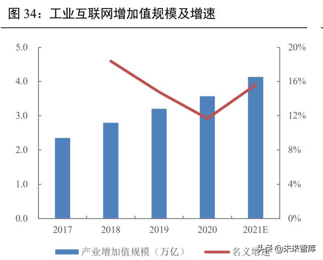 根据工业互联网研究院测算,2020 年我国工业互联网产业增加值规模达 到 3.57 万亿元,名义增速 11.66%,其中直接产业和渗透产业增加值为别为 0.95 和 2.62 万亿元,名义增速 分别为 10.17%和 12.21%,预计 2021 年,工业互联网产业增加值达到 4.13 万亿元,名义增速 15.60%,其中 直接产业和渗透产业增加值为别为 1.09 和 3.04 万亿元,名义增速分别为 14.74%和 16.03%。《“十四五”信 息通信行业发展规划》指出,到 2025 年基本建成覆盖各地区、各行业的高质量工业互联网网络,打造一批 “5G+工业互联网”标杆,工业互联网标识解析体系更加完善,服务能力大幅提高,建成一批有影响力的工 业互联网平台和公共服务平台,工业互联网平台普及率达到 45%。系列政策的推出表明工业互联网快速发 展的时期已经到来。