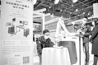 11月19日,工作人员在武汉举行的“5G+工业互联网成果展”现场演示5G远程超声机器人诊断平台。新华社发(伍志尊 摄)