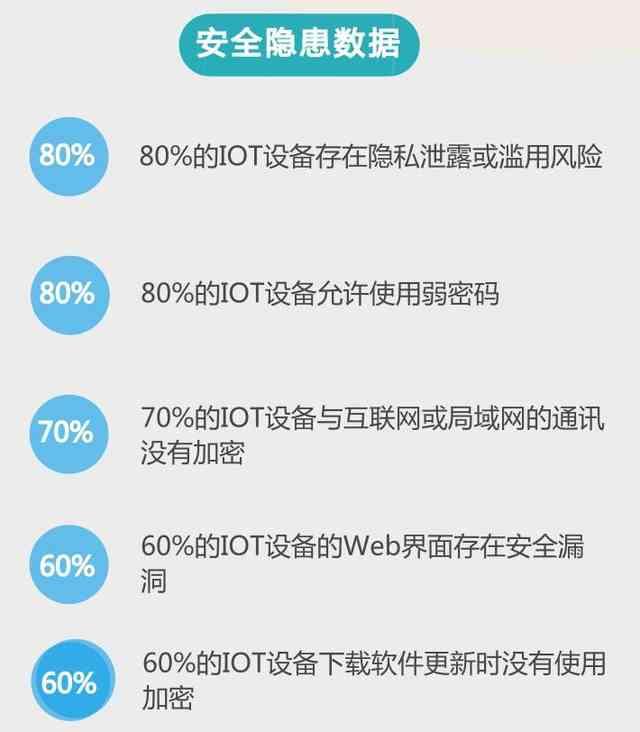 惠普安全研究院调查的10个最流行的物联网智能设备后发现几乎所有设备都存在高危漏洞,主要有五大安全隐患,关键数据如下: