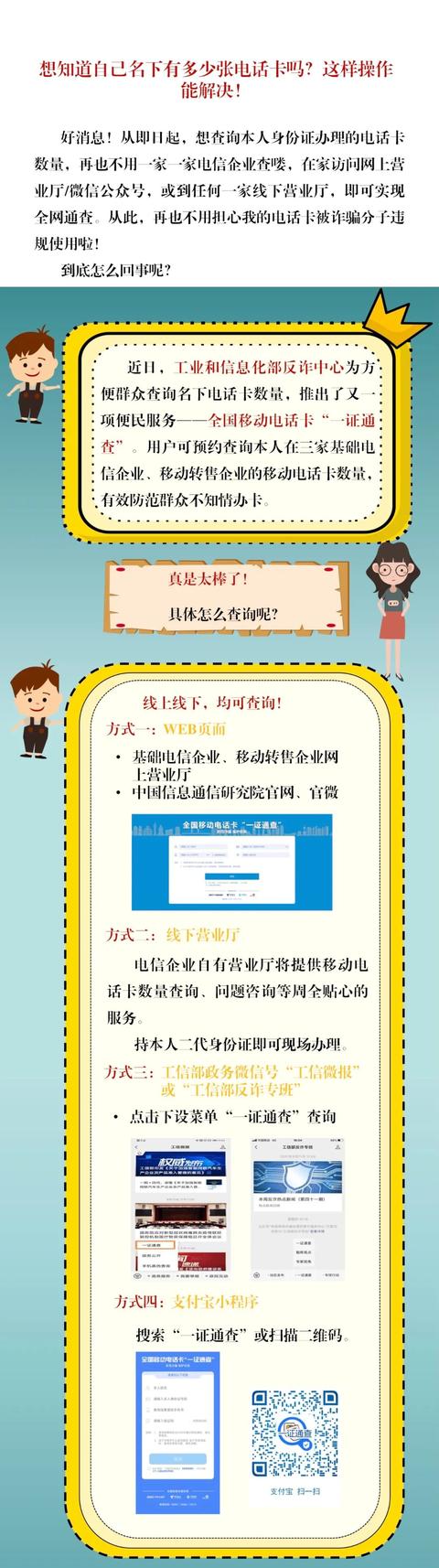 ● 线上渠道:用户可以通过“工信微报”和“工信部反诈专班”微信公众号、运营商网上营业厅、中国信息通信研究院官方网站、支付宝“一证通查”小程序等线上渠道提交预约查询申请。48小时内,服务平台会通过“10699000”专用短信端口告知用户名下所有电话卡数量及其所属的运营企业。