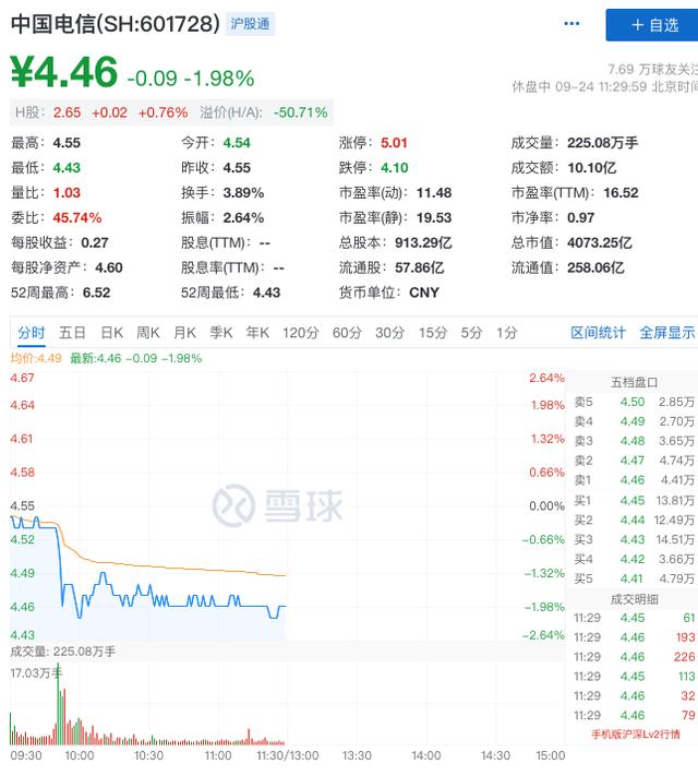 9月24日消息,中国电信A股盘中跌2.6%报4.43元/股,总市值4000亿元。