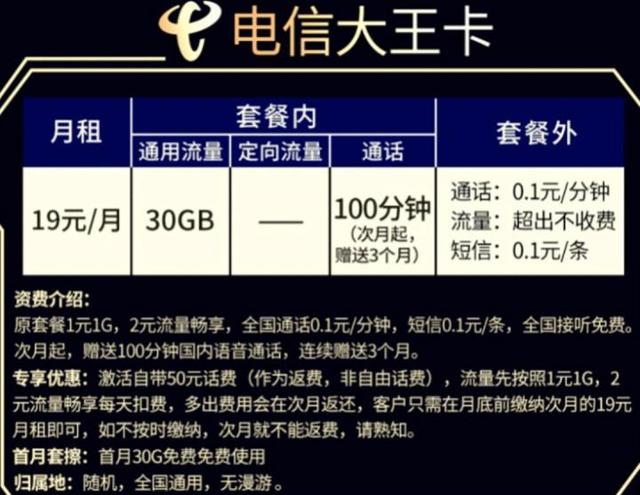 电信大王卡套餐可能对于一部分用户而言不适用,因为此款套餐月租19元,30G通用流量,超出30G的流量依旧不收费可以算是无限流量了,不过条件是30G流量仅仅首月免费,次月需要收费,大家感觉有点坑,对于偶尔需要出差外地的用户可能是一个不错的套餐,网友们,你们怎么看电信这款套餐呢?欢迎大家留言讨论。