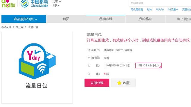 2.流量需求少的筒子不要买。大王卡比较适合流量需求多的筒子使用,如果你每天花1块钱买500M流量的话,加上19元月费,相当于每月49元可以享受约15G的通用流量+腾讯应用免流流量。15G流量如果订购移动的流量日包,得200多块了吧?(见下图)。但如果你流量使用少,一个月也就500M以内,那也别买这张卡了。