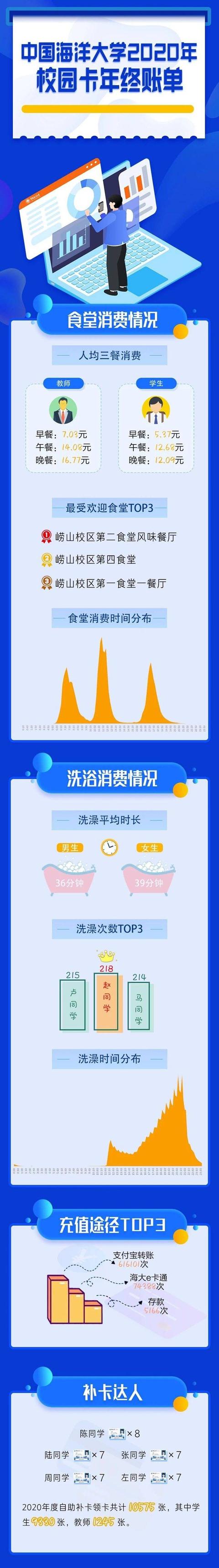 对大学生来说,校园一卡通承载着学生的校园生活轨迹。日前,中国海洋大学校园卡2020年度账单出炉。账单以校园卡消费数据为核心,呈现全校师生在学校工作及生活过程中的消费情,通过数据分析个人喜好、个人消费排行、超市、食堂排行等。有的同学一年补了8次校园卡,“一举夺得”“丢卡大王”之称号;还有的同学一年在学校洗了218次澡。